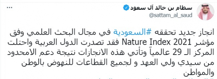 واعتبر في تغريدة على حسابه بموقع التدوين المصغر تويتر، اليوم أنه: "إنجاز جديد تحققه السعودية في مجال البحث العلمي وفق مؤشر 2021 Nature Index".