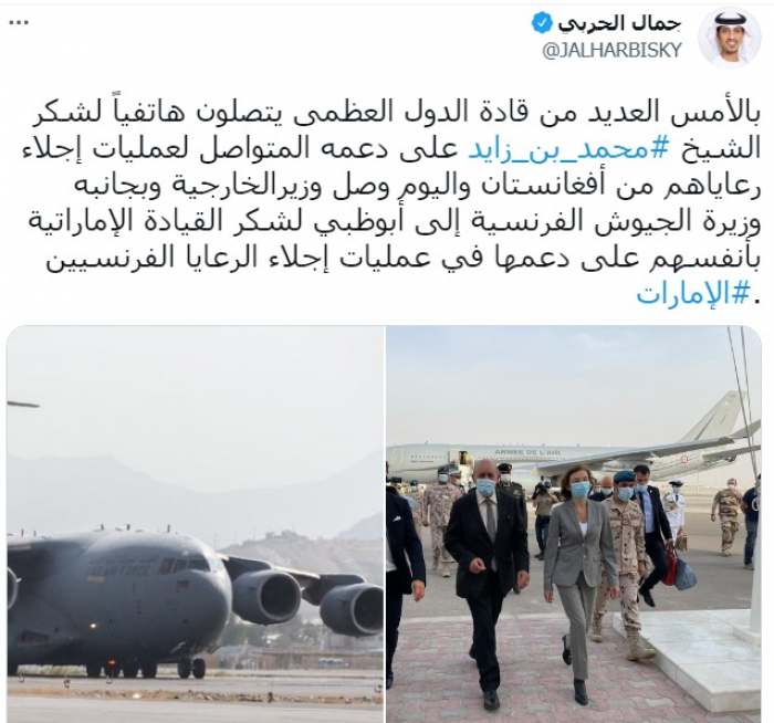 وشدد في تغريدة على حسابه بموقع التدوين المصغر تويتر، اليوم على أنه: "بالأمس العديد من قادة الدول العظمى يتصلون هاتفياً لشكر الشيخ محمد بن زايد على دعمه المتواصل لعمليات إجلاء رعاياهم من أفغانستان".