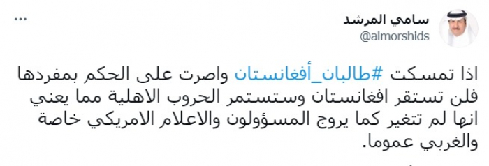 وشدد في تغريدة على حسابه بموقع التدوين المصغر تويتر، اليوم على أنه: "إذا تمسكت طالبان أفغانستان وأصرت على الحكم بمفردها فلن تستقر أفغانستان وستستمر الحروب الأهلية".