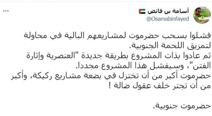 رأى الكاتب الصحفي أسامة بن فائض، أن الشرعية الإخوانية لجأت إلى بث الفتنة بين أبناء حضرموت، بعد فشلها في تسويق مشاريعها المرفوضة شعبيا.