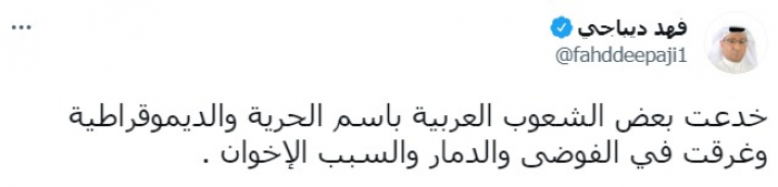 وأكد في تغريدة على حسابه بموقع التدوين المصغر تويتر، اليوم أنه: "خدعت بعض الشعوب العربية باسم الحرية والديموقراطية وغرقت في الفوضى والدمار والسبب الإخوان".