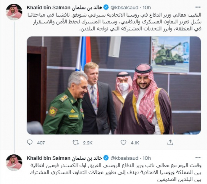 وقال في تغريدات عبر "تويتر" رصدها "المشهد العربي": "التقيت معالي وزير الدفاع في روسيا الاتحادية سيرغي شويغو. ناقشنا في مباحثاتنا سُبل تعزيز التعاون العسكري والدفاعي، وسعينا المشترك لحفظ الأمن والاستقرار في المنطقة، وأبرز التحديات المشتركة التي تواجه البلدين".