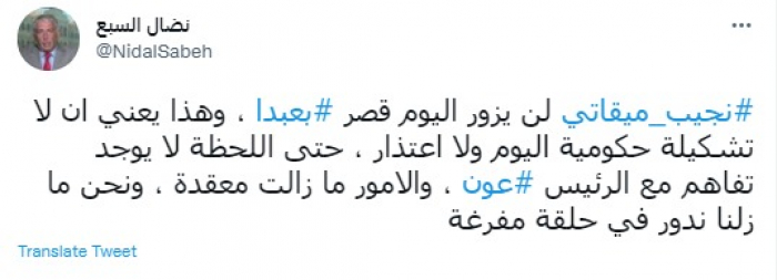وقال في تغريدة عبر "تويتر" رصدها "المشهد العربي": "نجيب ميقاتي لن يزور اليوم قصر بعبدا، وهذا يعني أن لا تشكيلة حكومية اليوم ولا اعتذار".