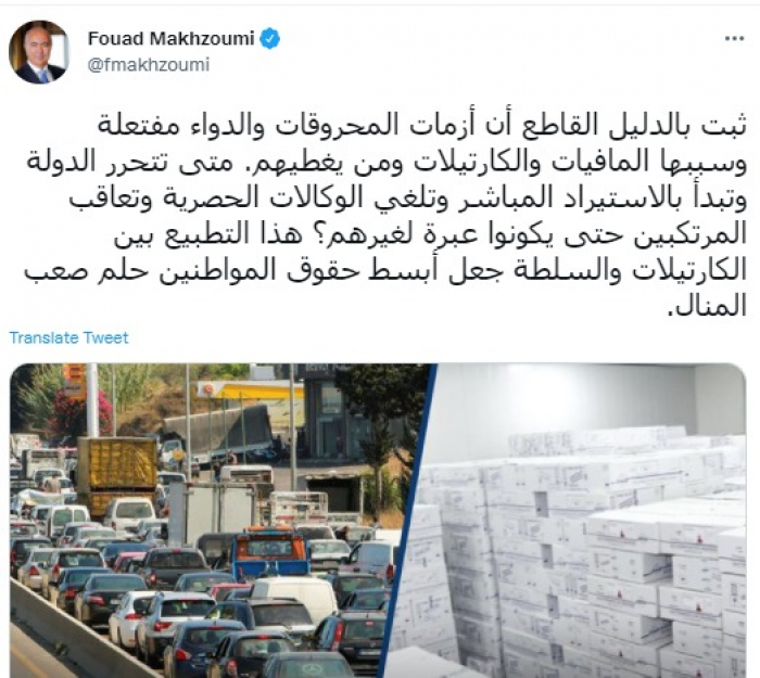 مخزومي: أزمة المحروقات والدواء مفتعلة في لبنان
