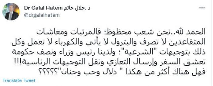 وتابع: "ولدينا رئيس وزراء ونصف حكومة تعشق السفر وإرسال التعازي ونقل التوجيهات الرئاسية".