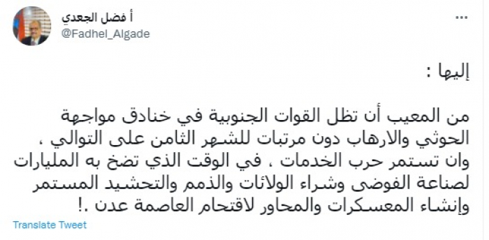استنكر عضو هيئة رئاسة المجلس الانتقالي الجنوبي فضل الجعدي، اليوم الثلاثاء، حرب الخدمات المفتعلة على الجنوب، في ظل استمرار الشرعية الإخوانية في السعي لصناعة الفوضى وإنشاء المعسكرات لاقتحام العاصمة عدن.