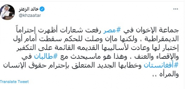 توقع المحلل السياسي السعودي خالد الزعتر، اليوم الثلاثاء، استخدام حركة طالبان لنفس شعارات جماعة الإخوان الإرهابية عند وصولها لحكم مصر.