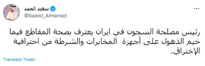 وكتب في تغريدة عبر "تويتر" رصدها "المشهد العربي": "رئيس مصلحة السجون في ايران يعترف بصحة المقاطع فيما خيم الذهول على أجهزة المخابرات والشرطة من احترافية الاختراق".