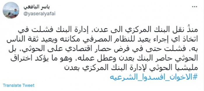 وكتب في تغريدة عبر "تويتر" رصدها "المشهد العربي": "منذُ نقل البنك المركزي الى عدن، إدارة البنك فشلت في اتخاذ أي إجراء يعيد للنظام المصرفي مكانته ويعيد ثقة الناس به، فشلت حتى في فرض حصار اقتصادي على الحوثي".