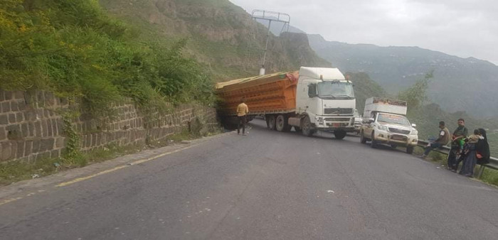 انزلقت شاحنة على طريق نقيل سمارة بين إب وصنعاء، اليوم الثلاثاء، وقطعت حركة المرور.