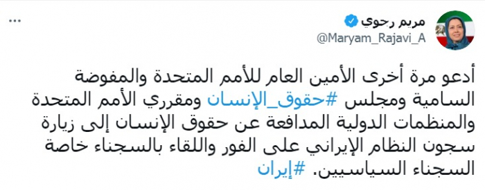 وأوضحت في تغريدة على حسابها بموقع التدوين المصغر تويترِ، اليوم أني: "أدعو مرة أخرى الأمين العام للأمم المتحدة والمفوضة السامية ومجلس حقوق الإنسان ومقرري الأمم المتحدة والمنظمات الدولية المدافعة عن حقوق الإنسان إلى زيارة سجون النظام الإيراني على الفور".
