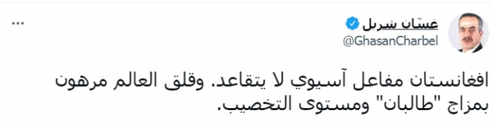 وأشار في تغريدة على حسابه بموقع التدوين المصغر تويترِ، اليوم إلى أن: "أفغانستان مفاعل آسيوي لا يتقاعد"، موضحا أن: "قلق العالم مرهون بمزاج طالبان، ومستوى التخصيب".