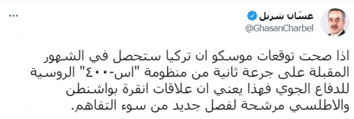 وأشار في تغريدة على حسابه بموقع التدوين المصغر تويتر، اليوم إلى أنه: "إذا صحت توقعات موسكو أن تركيا ستحصل في الشهور المقبلة على جرعة ثانية من منظومة "إس-٤٠٠" الروسية للدفاع الجوي فهذا يعني أن علاقات أنقرة بواشنطن والأطلسي مرشحة لفصل جديد من سوء التفاهم".