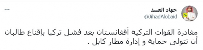 وكشف في تغريدة على حسابه بموقع التدوين المصغر تويتر، اليوم عن: "مغادرة القوات التركية أفغانستان بعد فشل تركيا بإقناع طالبان أن تتولى حماية وإدارة مطار كابل".