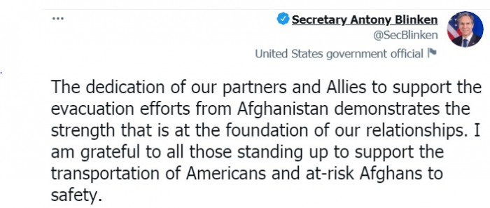 وأكد في تغريدة على حسابه بموقع التدوين المصغر تويتر، اليوم أن: "تفاني شركائنا وحلفائنا لدعم جهود الإجلاء من أفغانستان يوضح القوة التي تشكل أساس علاقاتنا".