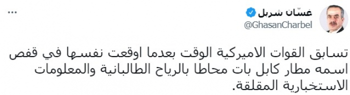 ورأى في تغريدة على حسابه بموقع التدوين المصغر تويتر، اليوم أنه: "تسابق القوات الأميركية الوقت بعدما أوقعت نفسها في قفص اسمه مطار كابل بات محاطا بالرياح الطالبانية والمعلومات الاستخبارية المقلقة".