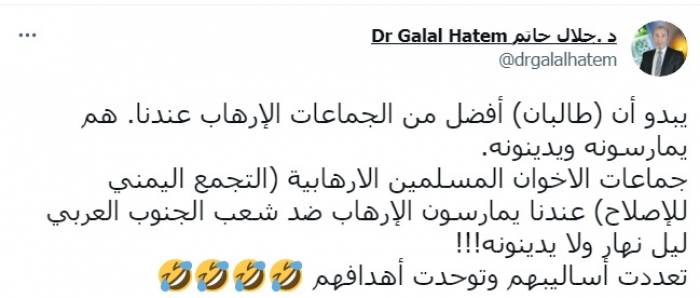 ورأى في تغريدة على حسابه بموقع التدوين المصغر تويتر، اليوم أنه: "يبدو أن طالبان أفضل من جماعات الإرهاب عندنا، هم يمارسونه ويدينونه".