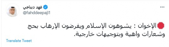 وقال في تغريدة عبر "تويتر" رصدها "المشهد العربي": "الإخوان: يشوهون الإسلام ويفرضون الإرهاب بحج وشعارات واهية وبتوجيهات خارجية".