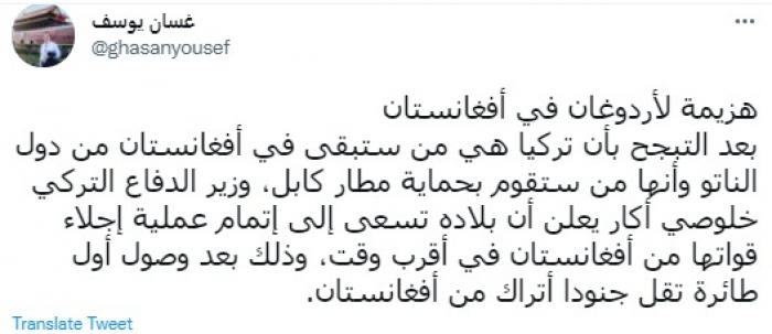 وقال في تغريدة عبر "تويتر" رصدها "المشهد العربي": "هزيمة لأردوغان في أفغانستان بعد التبجح بأن تركيا هي من ستبقى في أفغانستان من دول الناتو وأنها من ستقوم بحماية مطار كابل".
