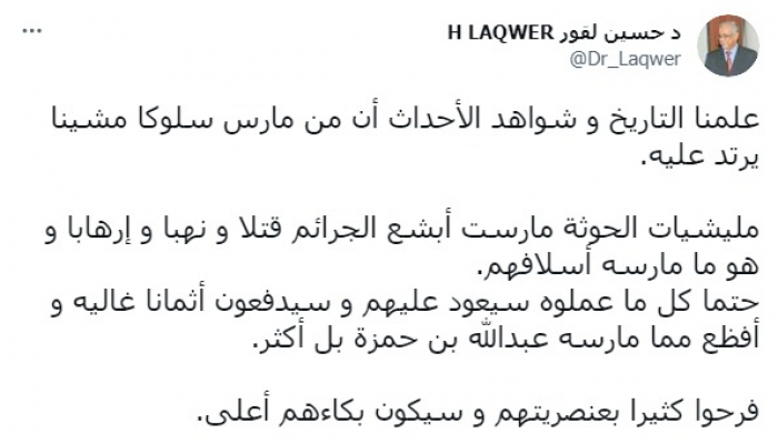 وكشف في تغريدة على حسابه بموقع التدوين المصغر تويتر، اليوم أنه: "علمنا التاريخ وشواهد الأحداث أن من مارس سلوكا مشينا يرتد عليه"، مضيفا أن: "مليشيات الحوثة مارست أبشع الجرائم قتلا ونهبا وإرهابا وهو ما مارسه أسلافهم".