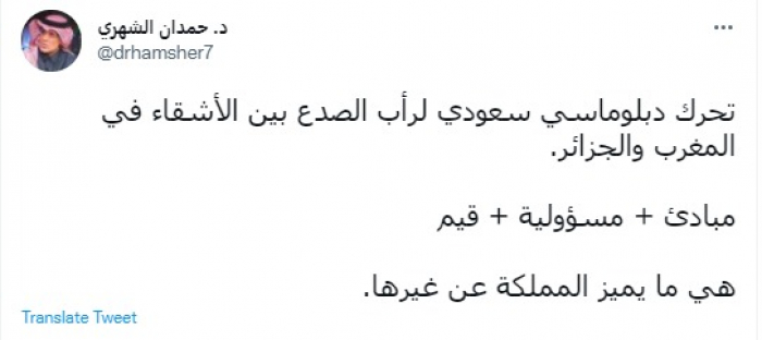وقال في تغريدة عبر "تويتر" رصدها "المشهد العربي": "تحرك دبلوماسي سعودي لرأب الصدع بين الأشقاء في المغرب والجزائر".