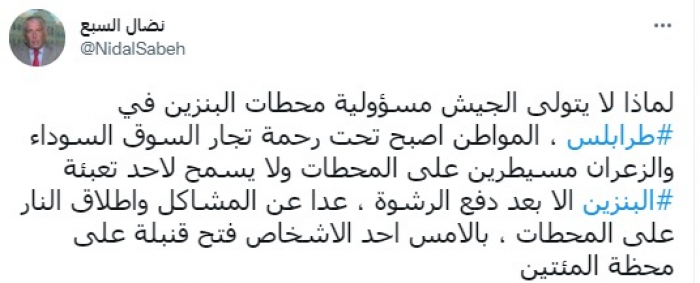 دعا المحلل السياسي اللبناني نضال السبع، اليوم السبت، الجيش اللبناني إلى تولي مسؤولية محطات البنزين في مدينة طرابلس.