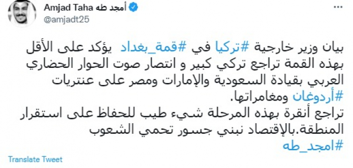 وكتب في تغريدة عبر "تويتر" رصدها "المشهد العربي": "بيان وزير خارجية تركيا في قمة بغداد يؤكد على الأقل بهذه القمة تراجع تركي كبير وانتصار صوت الحوار الحضاري العربي بقيادة السعودية والإمارات ومصر على عنتريات أردوغان ومغامراتها".