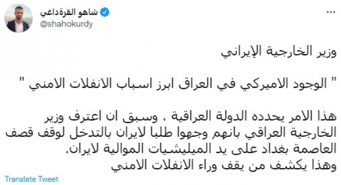 وقال في تغريدة عبر "تويتر" رصدها "المشهد العربي": "الوجود الأمريكي في العراق أبرز اسباب الانفلات الأمني.. هذا الأمر يحدده الدولة العراقية ، وسبق أن اعترف وزير الخارجية العراقي بأنهم وجهوا طلبا لإيران بالتدخل لوقف قصف العاصمة بغداد على يد الميليشيات الموالية لإيران".