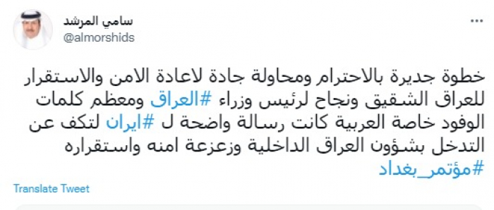 وقال في تغريدة عبر "تويتر" رصدها "المشهد العربي": "خطوة جديرة بالاحترام ومحاولة جادة لإعادة الأمن والاستقرار للعراق الشقيق ونجاح لرئيس وزراء العراق ومعظم كلمات الوفود خاصة العربية كانت رسالة واضحة لإيران لتكف عن التدخل بشؤون العراق الداخلية وزعزعة امنه واستقراره".