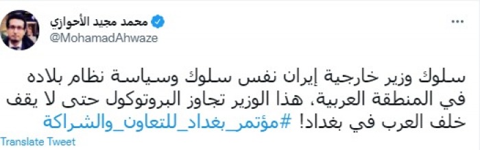وقال في تغريدة عبر "تويتر" رصدها "المشهد العربي": "سلوك وزير خارجية إيران نفس سلوك وسياسة نظام بلاده في المنطقة العربية، هذا الوزير تجاوز البروتوكول حتى لا يقف خلف العرب في بغداد".