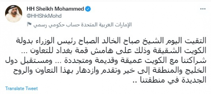 وقال في تغريدة عبر "تويتر" رصدها "المشهد العربي": "التقيت اليوم الشيخ صباح الخالد الصباح رئيس الوزراء بدولة الكويت الشقيقة وذلك على هامش قمة بغداد للتعاون… شراكتنا مع الكويت عميقة وقديمة ومتجددة".