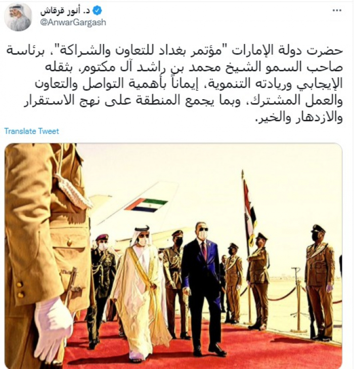 وقال في تغريدة عبر "تويتر" رصدها "المشهد العربي": "حضرت دولة الإمارات مؤتمر بغداد للتعاون والشراكة، برئاسة صاحب السمو الشيخ محمد بن راشد آل مكتوم، بثقله الإيجابي وريادته التنموية، إيمانًا بأهمية التواصل والتعاون والعمل المشترك، وبما يجمع المنطقة على نهج الاستقرار والازدهار والخير".