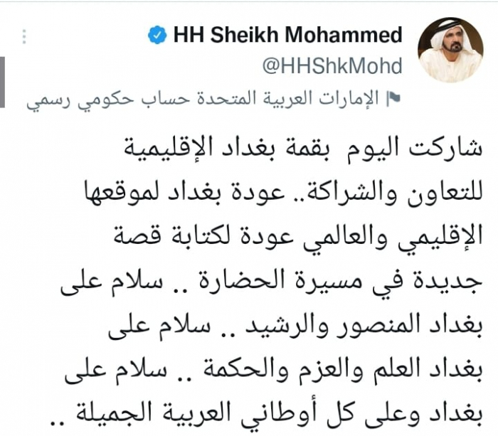 وأضاف أن: "عودة بغداد لموقعها الإقليمي والعالمي عودة لكتابة قصة جديدة في مسيرة الحضارة"، متابعا: سلام على بغداد المنصور والرشيد .. سلام على بغداد العلم والعزم والحكمة .. سلام على بغداد وعلى كل أوطاني العربية الجميلة".