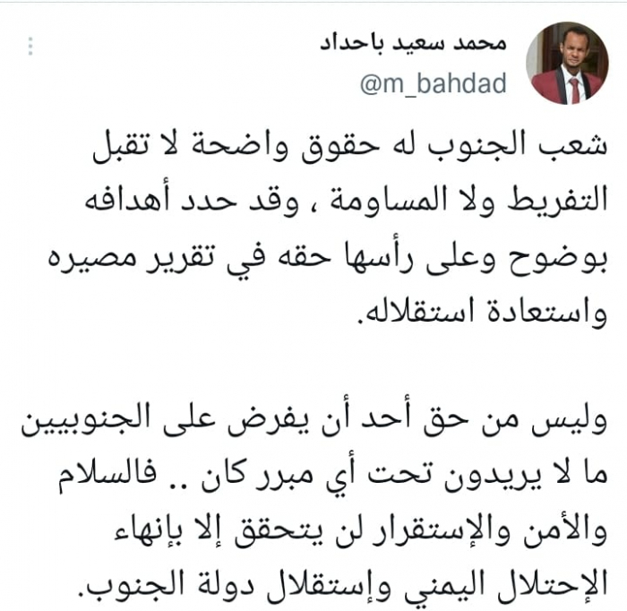 وشدد في تغريدة على حسابه بموقع التدوين المصغر تويتر اليوم على أن: "شعب الجنوب له حقوق واضحة لا تقبل التفريط ولا المساومة، وقد حدد أهدافه بوضوح وعلى رأسها حقه في تقرير مصيره واستعادة استقلاله".
