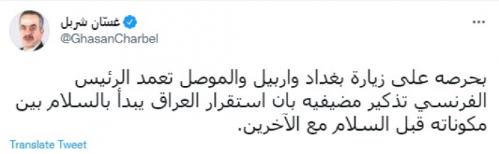 وقال في تغريدة عبر "تويتر" رصدها "المشهد العربي": "بحرصه على زيارة بغداد وأربيل والموصل تعمد الرئيس الفرنسي تذكير مضيفيه بأن استقرار العراق يبدأ بالسلام بين مكوناته قبل السلام مع الآخرين".