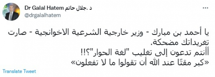 وقال في تغريدة عبر "تويتر" رصدها "المشهد العربي": "يا أحمد بن مبارك - وزير خارجية الشرعية الإخوانجية - صارت تغريداتك مضحكة".