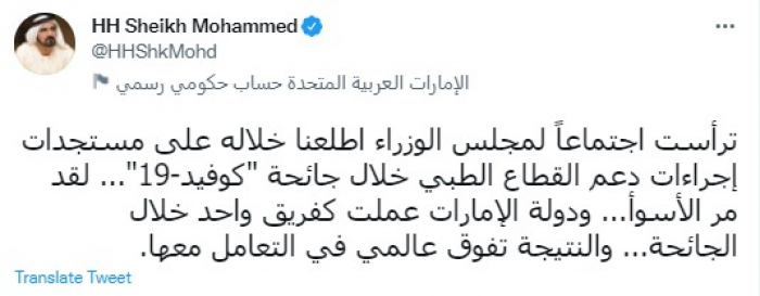 وقال في سلسلة تغريدات عبر "تويتر" رصدها "المشهد العربي": "ترأست اجتماعاا لمجلس الوزراء اطلعنا خلاله على مستجدات إجراءات دعم القطاع الطبي خلال جائحة كوفيد-19... لقد مر الأسوأ... ودولة الإمارات عملت كفريق واحد خلال الجائحة... والنتيجة تفوق عالمي في التعامل معها".