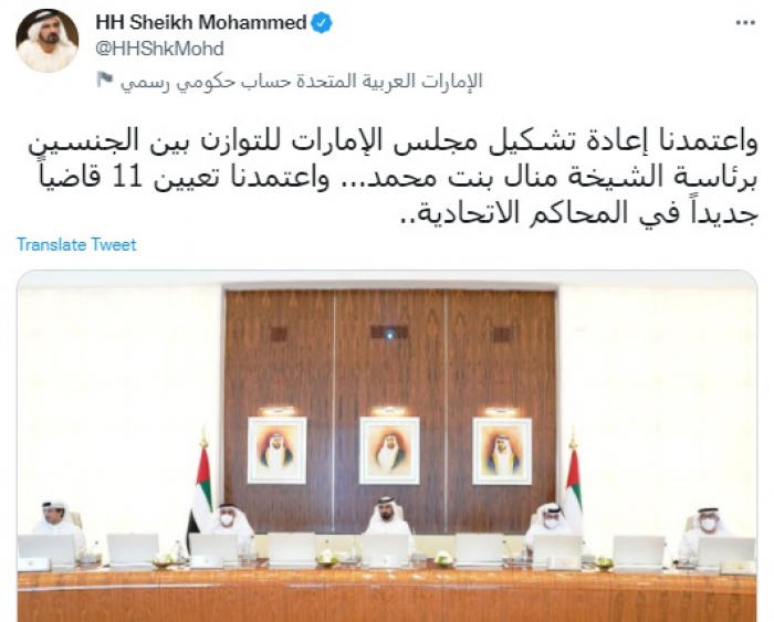 وتابع: "واعتمدنا إعادة تشكيل مجلس الإمارات للتوازن بين الجنسين برئاسة الشيخة منال بنت محمد... واعتمدنا تعيين 11 قاضياً جديداً في المحاكم الاتحادية".