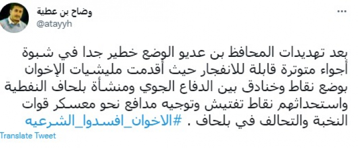 وكتب في تغريدة عبر "تويتر" رصدها "المشهد العربي": "بعد تهديدات المحافظ بن عديو الوضع خطير جدا في شبوة أجواء متوترة قابلة للانفجار حيث أقدمت مليشيات الإخوان بوضع نقاط وخنادق بين الدفاع الجوي ومنشأة بلحاف النفطية واستحداثهم نقاط تفتيش وتوجيه مدافع نحو معسكر قوات النخبة والتحالف في بلحاف".