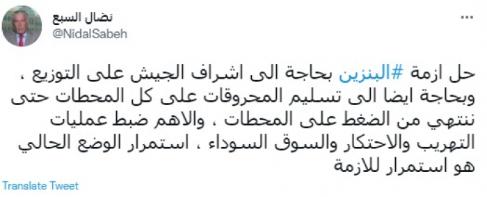 وكتب في تغريدة عبر "تويتر" رصدها "المشهد العربي": "حل ازمة البنزين بحاجة إلى إشراف الجيش على التوزيع ، وبحاجة أيضًا إلى تسليم المحروقات على كل المحطات حتى ننتهي من الضغط على المحطات".