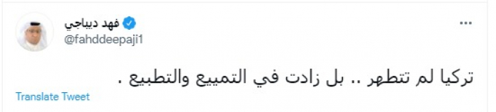 وقال في تغريدة عبر "تويتر" رصدها "المشهد العربي": "تركيا لم تتطهر .. بل زادت في التمييع والتطبيع".