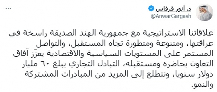 وكشف في تغريدة على حسابه بموقع التدوين المصغر تويتر، اليوم أن: "علاقاتنا الاستراتيجية مع جمهورية الهند الصديقة راسخة في عراقتها، ومتنوعة ومتطورة تجاه المستقبل، والتواصل المستمر على المستويات السياسية والاقتصادية يعزّز آفاق التعاون بحاضره ومستقبله".