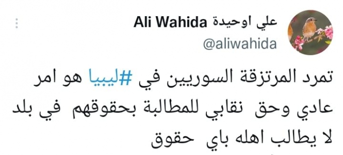 وقال في تغريدة على حسابه بموقع التدوين المصغر تويتر اليوم إن: "تمرد المرتزقة السوريين في ليبيا هو أمر عادي وحق نقابي للمطالبة بحقوقهم في بلد لا يطالب أهله بأي حقوق".