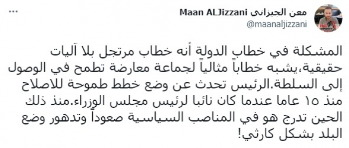 واشار في تغريدة على حسابه بموقع التدوين المصغر تويتر إلى أن: "المشكلة في خطاب الدولة أنه خطاب مرتجل بلا آليات حقيقية يشبه خطاباً مثالياً لجماعة معارضة تطمح في الوصول إلى السلطة".