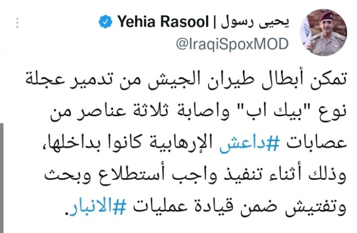 وشدد في تغريدة على حسابه بموقع التدوين المصغر تويتر، اليوم على: "تمكن أبطال طيران الجيش من تدمير عجلة نوع "بيك أب" وإصابة ثلاثة عناصر من عصابات داعش الإرهابية كانوا بداخلها".