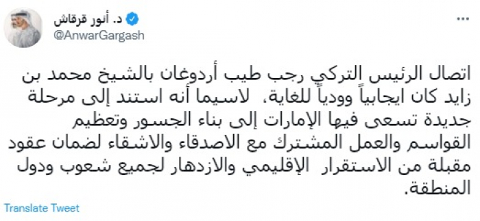 وقال في تغريدة عبر "تويتر" رصدها "المشهد العربي": "اتصال الرئيس التركي رجب طيب أردوغان بالشيخ محمد بن زايد كان إيجابيًا ووديًا للغاية".