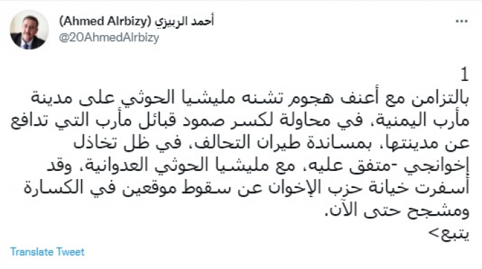 وقال في تغريدات عبر "تويتر" رصدها "المشهد العربي": "بالتزامن مع أعنف هجوم تشنه مليشيا الحوثي على مدينة مأرب اليمنية، في محاولة لكسر صمود قبائل مأرب التي تدافع عن مدينتها، بمساندة طيران التحالف، في ظل تخاذل إخوانجي -متفق عليه، مع مليشيا الحوثي العدوانية، وقد أسفرت خيانة حزب الإخوان عن سقوط موقعين في الكسارة ومشجح حتى الآن".