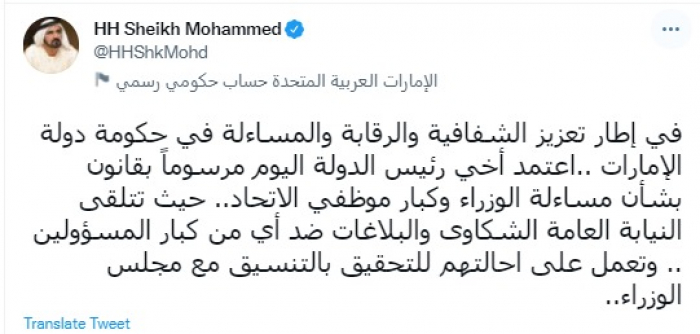 وقال في تغريدات عبر "تويتر" رصدها "المشهد العربي": "في إطار تعزيز الشفافية والرقابة والمساءلة في حكومة دولة الإمارات ..اعتمد أخي رئيس الدولة اليوم مرسوماً بقانون بشأن مساءلة الوزراء وكبار موظفي الاتحاد.. حيث تتلقى النيابة العامة الشكاوى والبلاغات ضد أي من كبار المسؤولين .. وتعمل على احالتهم للتحقيق بالتنسيق مع مجلس الوزراء".