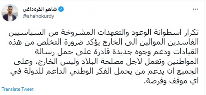 دعا الكاتب الصحفي العراقي شاهو القرةداغي، اليوم الثلاثاء، إلى التخلص من الطبقة السياسية في العراق.