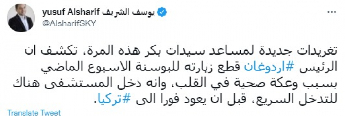 وقال في تغريدة عبر "تويتر" رصدها "المشهد العربي": "تغريدات جديدة لمساعد سيدات بكر هذه المرة، تكشف أن الرئيس أردوغان قطع زيارته للبوسنة الأسبوع الماضي بسبب وعكة صحية في القلب، وانه دخل المستشفى هناك للتدخل السريع، قبل أن يعود فورا إلى تركيا".